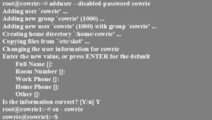 Add a new user with the name 'cowrie' by deactivating the password, then login as 'cowrie: