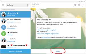 Select @BotFather then press START to start creating a Telegram Bot (Figure 8).