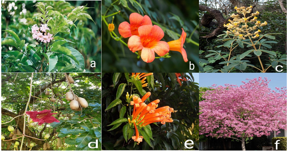 Figure 1: The plants of Bignoniaceae Family (a), Newbouldia laevis (P.Beauv.) Seem. (b), Campsis grandiflora K.Schum. (c), Zeyheria montana Mart. (d), Kigelia africana (Lam.) Benth. (e), Pyrostegia venusta Miers (f) Tabebuia impetiginosa Standl