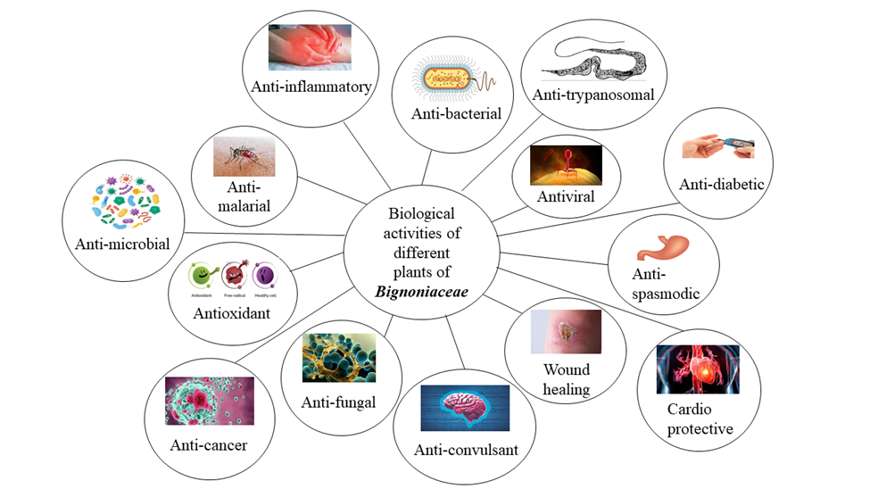 The Bignoniaceae family includes important ornamental plants with gigantic, striking flowers [4]. The family is distinguished by the wide variety of vibrant, beautiful flowers they produce [8]. Alkaloids, flavones, polyphenols, naphthoquinones, tannins, triterpenes, seed oils, and iridoid glucosides are the main chemical constituents that are recognised in this family [11]. It consists of species which have been utilised traditionally for a variety of conditions [12] like fungus infections [13], snakebites, skin conditions, gynaecological conditions, cancer, cholera, gastrointestinal problems, respiratory issues, urinary problems, hepatic conditions, epilepsy, sexually transmitted diseases, pain, malaria, and heart conditions [14].