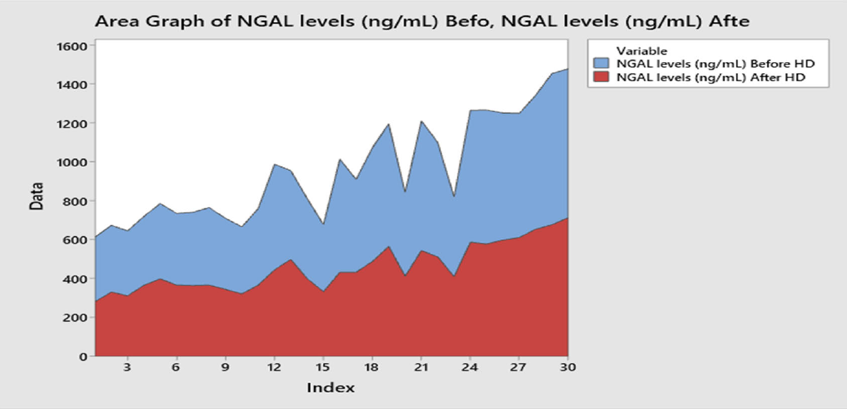 In line with our finding, Aghsaeifard et al. [1] estimate the level of NGAL in 47 patients under chronic hemodialysis in end-stage renal disease (ESRD) and 15 healthy controls and recorded a significant elevation of NGAL concentration patients under chronic hemodialysis. Furthermore, studies have consistently demonstrated that neutrophil gelatinase-associated lipocalin (NGAL) levels are associated with the severity and progression of chronic kidney disease (CKD) and suggested that NGAL may serve as a valuable biomarker for assessing the extent of renal damage and underlying disease progression in CKD [2,3,4]. Moreover, Alderson et al. [5] found that blood NGAL levels in patients with chronic kidney disease (CKD) are an independent risk factor for progressing to end-stage renal disease (ESRD). They suggest that higher levels of NGAL in the blood are associated with an increased risk of ESRD and suggest that monitoring NGAL levels may aid in identifying patients at higher risk of developing ESRD, enabling timely intervention. In addition, Lobato et al. [6] conducted a study that compared the levels of NGAL in hemodialysis (HD) patients with those in control individuals. They found that HD patients had elevated levels of NGAL, indicating its potential as a biomarker in this population. The study also highlighted the predictive value of NGAL in assessing the progression of chronic kidney disease (CKD), particularly in the later stages. These findings suggest that NGAL can serve as a valuable tool for monitoring kidney function and disease progression in HD patients, aiding in the early detection and management of CKD [7]. Hemodialysis (HD) patients often experience ongoing renal injury and inflammation due to the underlying chronic kidney disease (CKD) and the process of dialysis itself. This sustained renal injury can lead to increased levels of neutrophil gelatinase-associated lipocalin (NGAL) in HD patients [8]. The NGAL is a protein that is produced and released by various cells, including renal tubular cells, in response to kidney injury and inflammation [9]. It is considered an early and sensitive biomarker for renal damage. In HD patients, the repeated exposure to dialysis, vascular access procedures, and potential complications such as infections can contribute to ongoing renal injury and inflammation [10]. The progression of kidney damage is characterized by elevated levels of two important chemical substances in the blood, namely creatinine and urea [11]. These substances are indicators of kidney function and are commonly used to assess Glomerular Filtration Rate (GFR) and renal function [12]. It's important to note that creatinine and urea are not directly toxic themselves but rather serve as measures of kidney function [13].