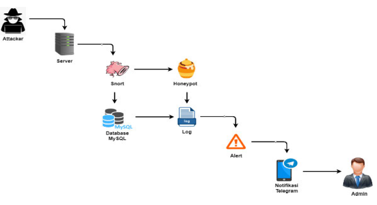The system workflow in this study is to have a two-stage network security process to secure the server, the first using the Network Intrusion Prevention System (NIPS) security system, namely Snort and the second using the Fake Server, namely Honeypot. In the first stage, if an attacker tries to attack the server, the Network Intrusion Prevention System (NIPS) system in this case, will automatically record data about the attack into the MySQL database and create a log on the system. And will immediately disconnect (drop) the connection from the attacker. The system will warn by sending a message to the network admin via notification via the telegram application using the python programming language [16].