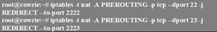 Configure IP tables to direct traffic 22 and 23 to ports 2222 and 2223 as follows: